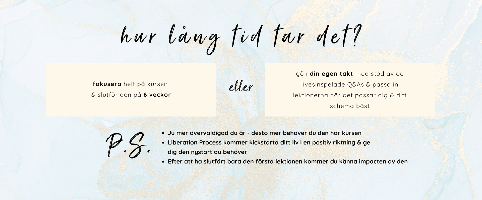 ✨ Du har lifetime access till allt kursmaterial, så du kan ta det i din egen takt – oavsett om du halkar efter eller behöver pausa. Du förlorar däremot tillgången till de live Q&A-mötena efter 6 veckor, men du kan alltid se inspelningarna i videobiblioteket när det passar dig.