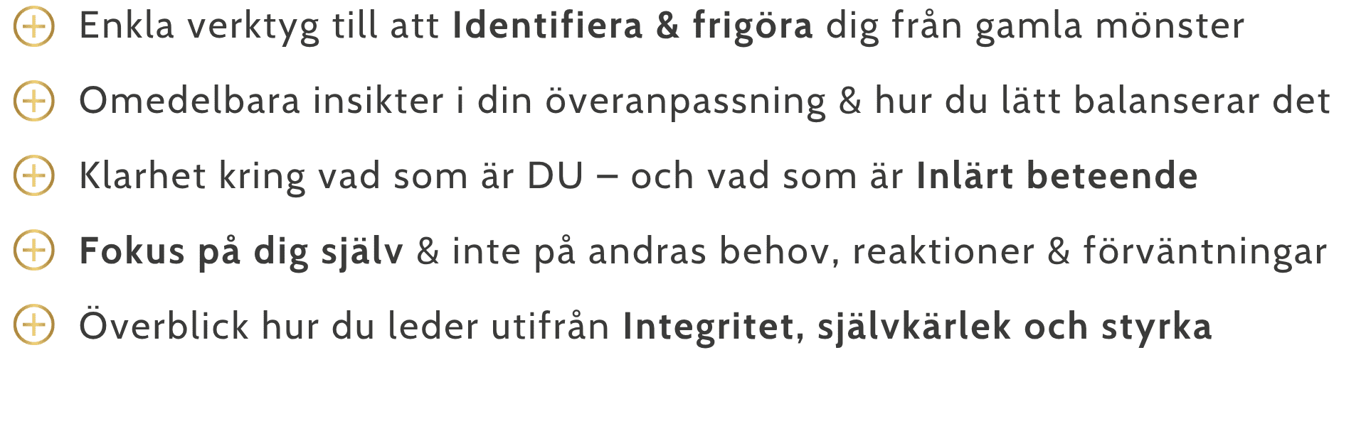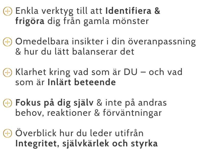 Mina beprövade tekniker, nycklar & rutiner som tog mig från överanpassning & people pleasing – till styrka & självkompetens vilket genererar energi som stöttar, lyfter & håller mig i allt jag gör. Jag vet att det kommer göra detsamma för dig!